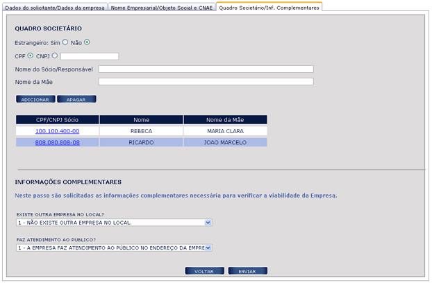 - Para eliminar um sócio ou responsável, clique no CPF ou CNPJ na tabela e, a seguir, no botão APAGAR.